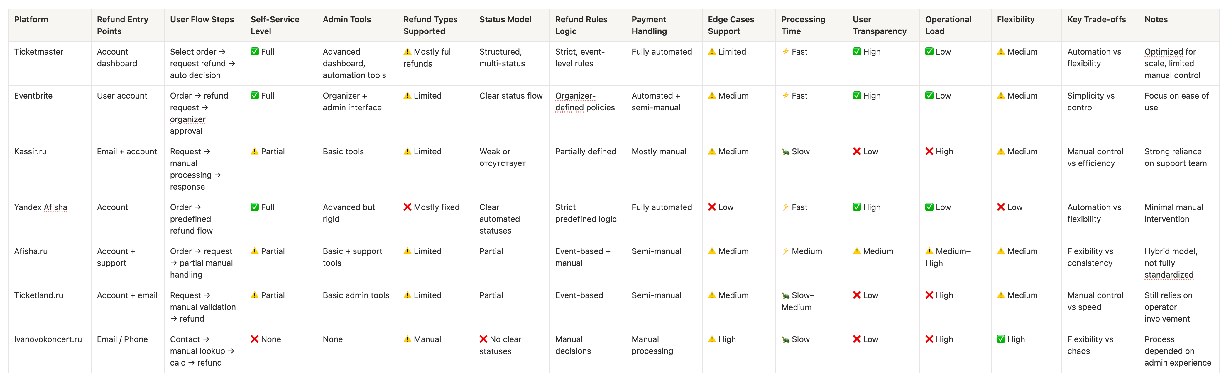 As part of the research, I conducted a comparative analysis of both international and Russian ticketing platforms, focusing on how refund processes are structured, how users initiate requests, and how they are handled operationally. I analyzed the end-to-end refund flow, including entry points, processing methods, levels of automation, and system capabilities, to identify common patterns and gaps across different solutions.