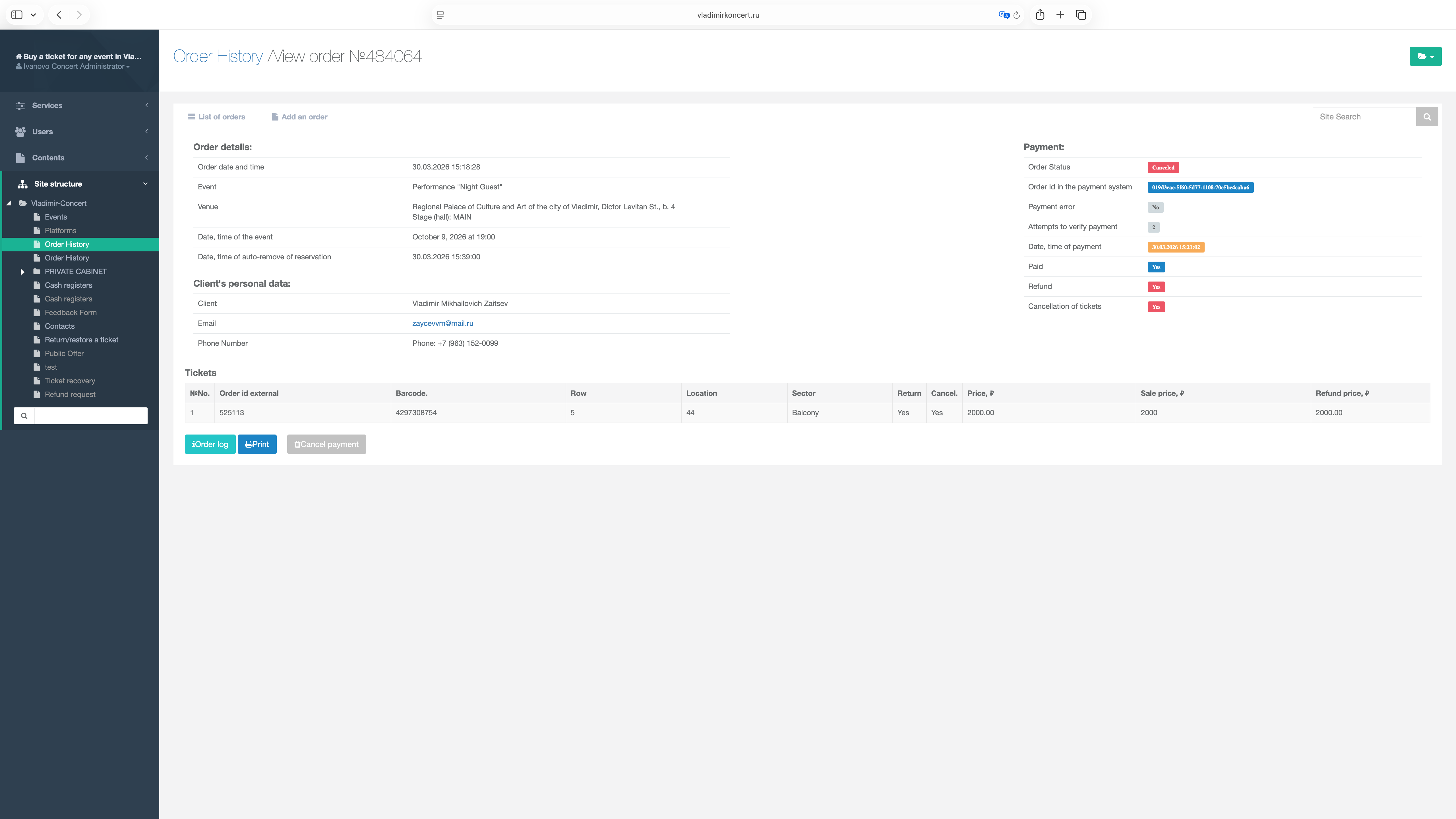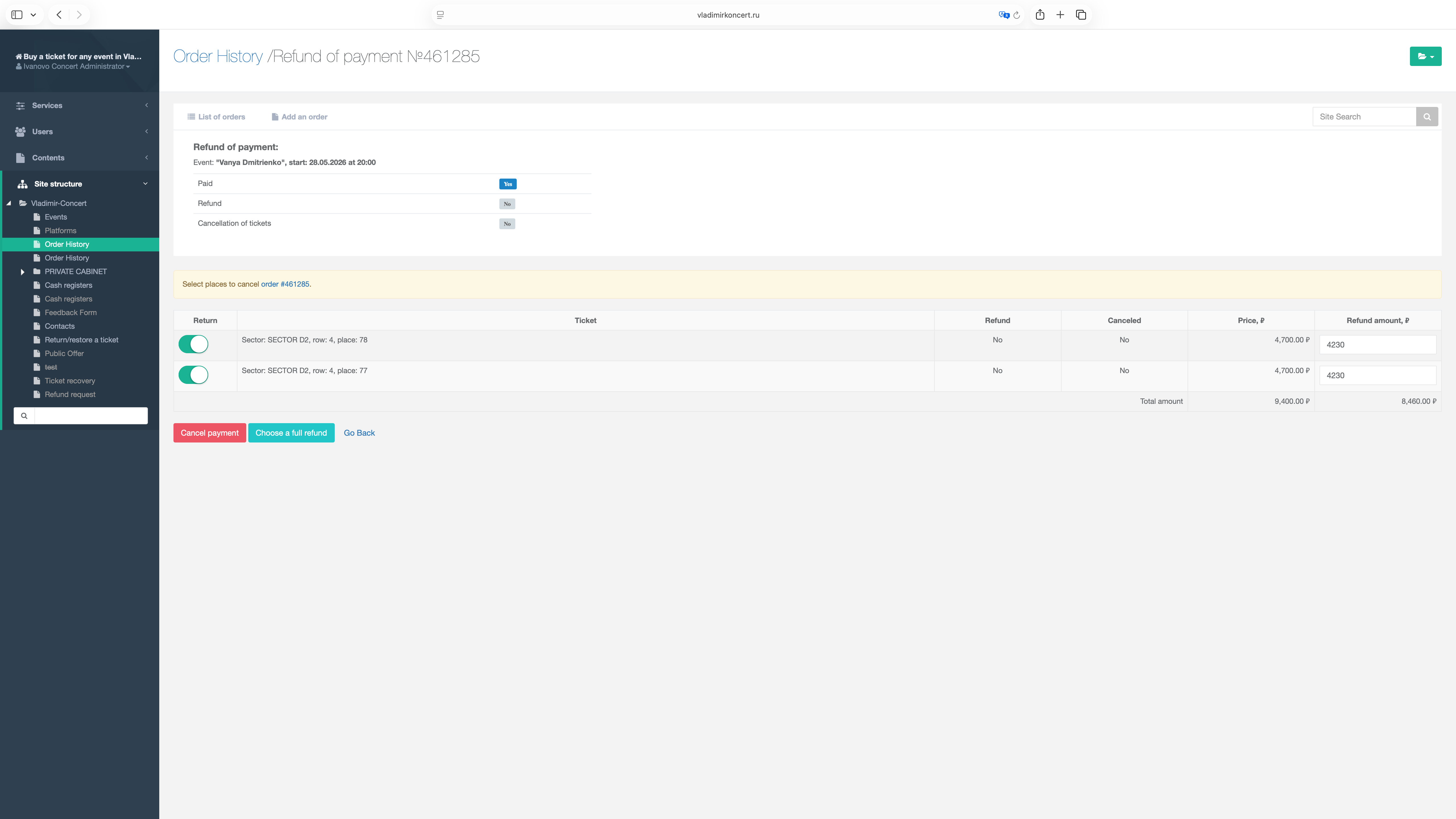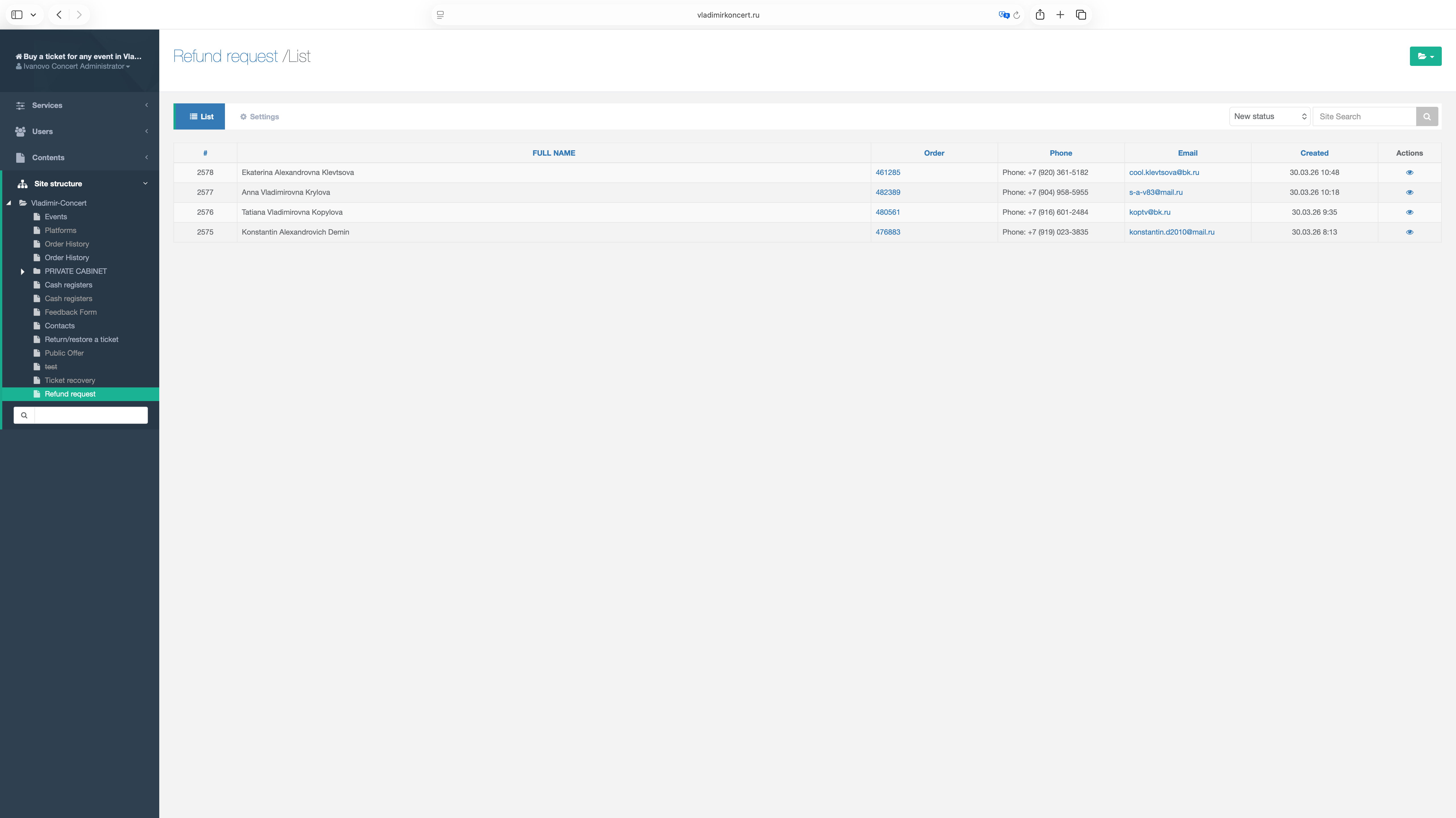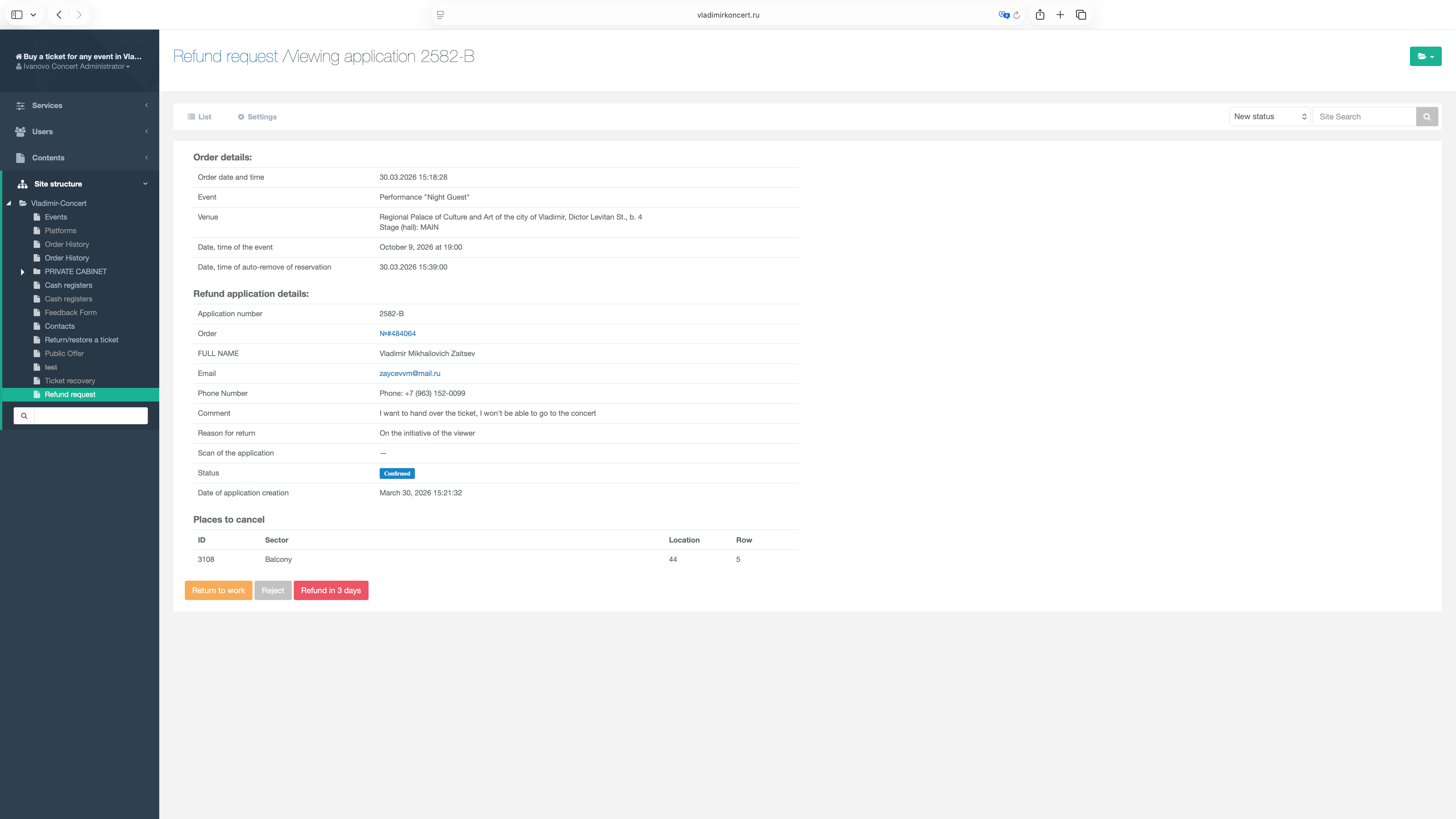 I designed a refund management system within Ivanovokoncert.ru that replaces manual handling with a centralized admin workflow. Refund requests are submitted via the website and automatically linked to orders.