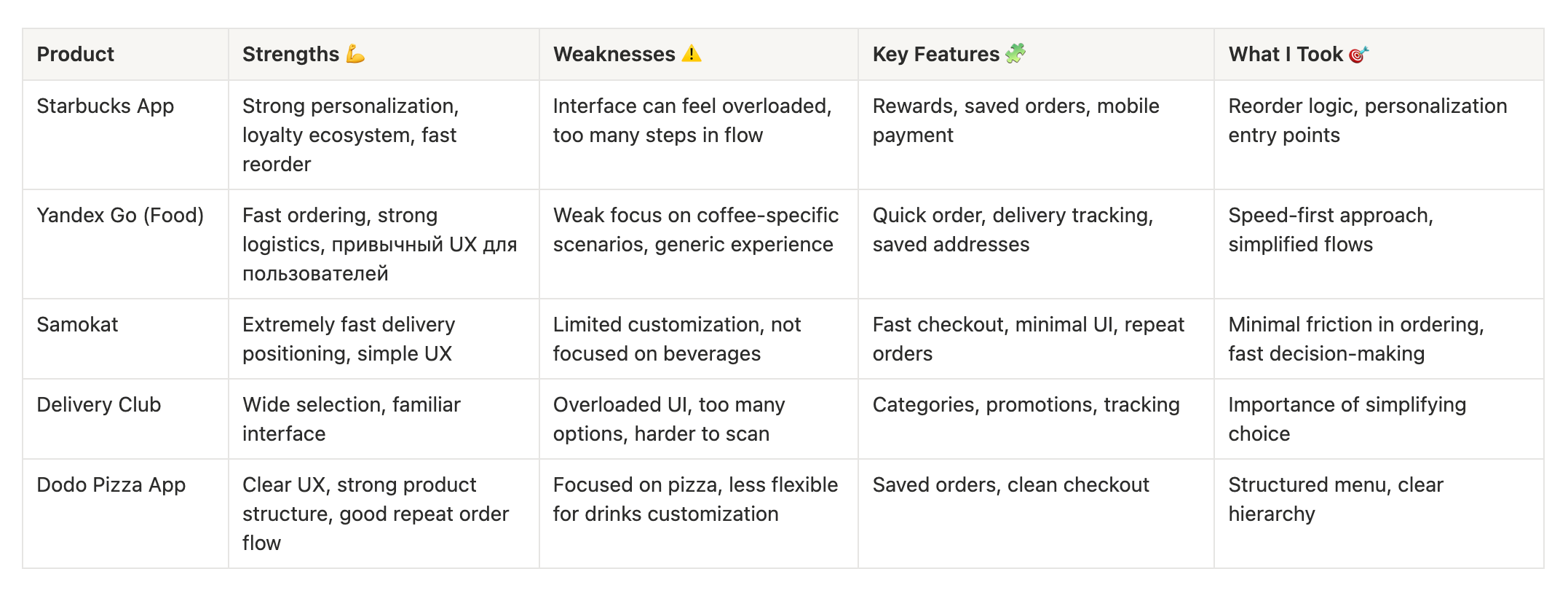 Conducted a competitor analysis of leading food delivery and coffee apps (Starbucks, Yandex Go, Samokat, Delivery Club, Dodo Pizza) to benchmark ordering, personalization, and fulfillment flows.