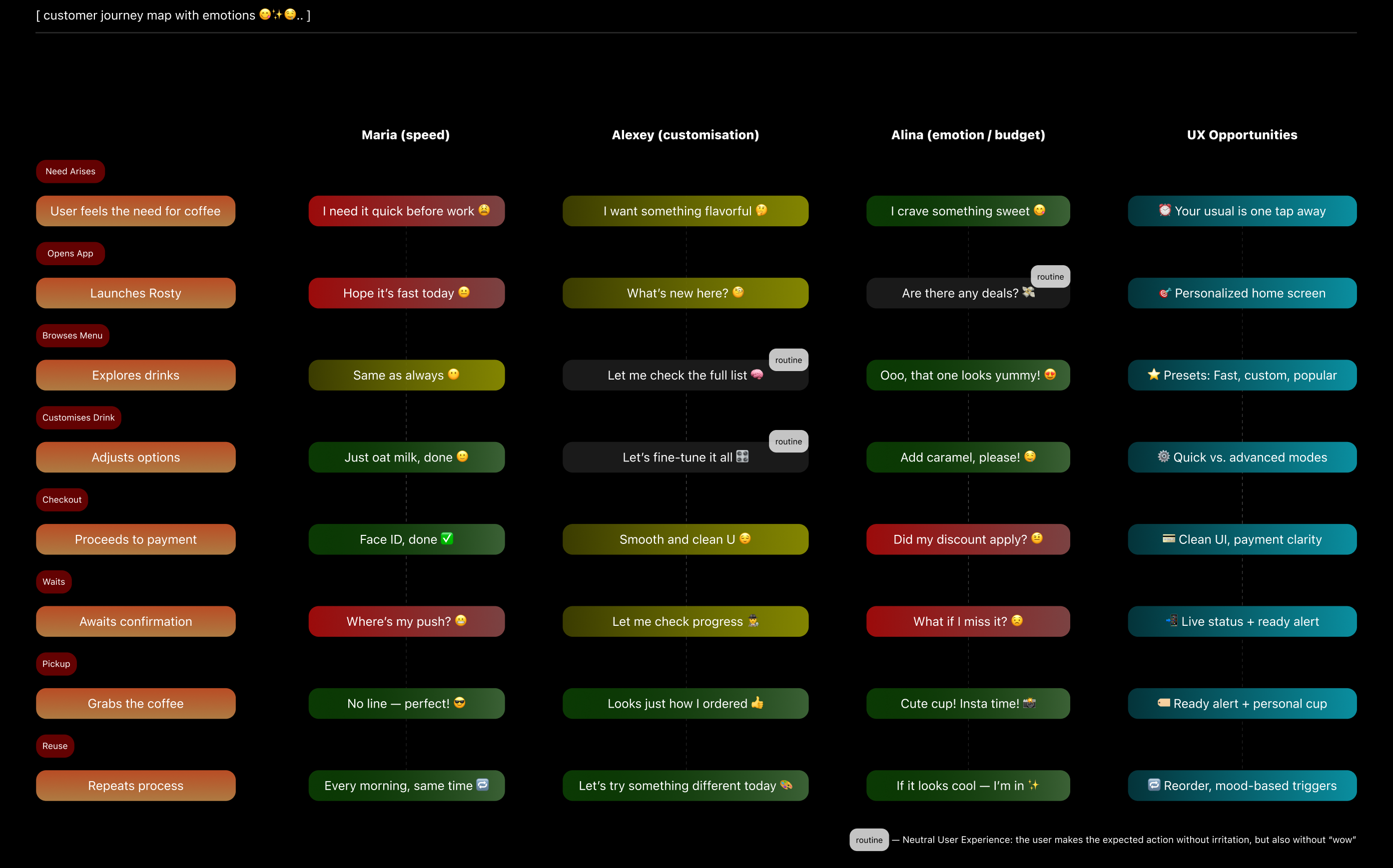 To better understand the end-to-end user experience, I mapped the customer journey across the key stages of ordering coffee.