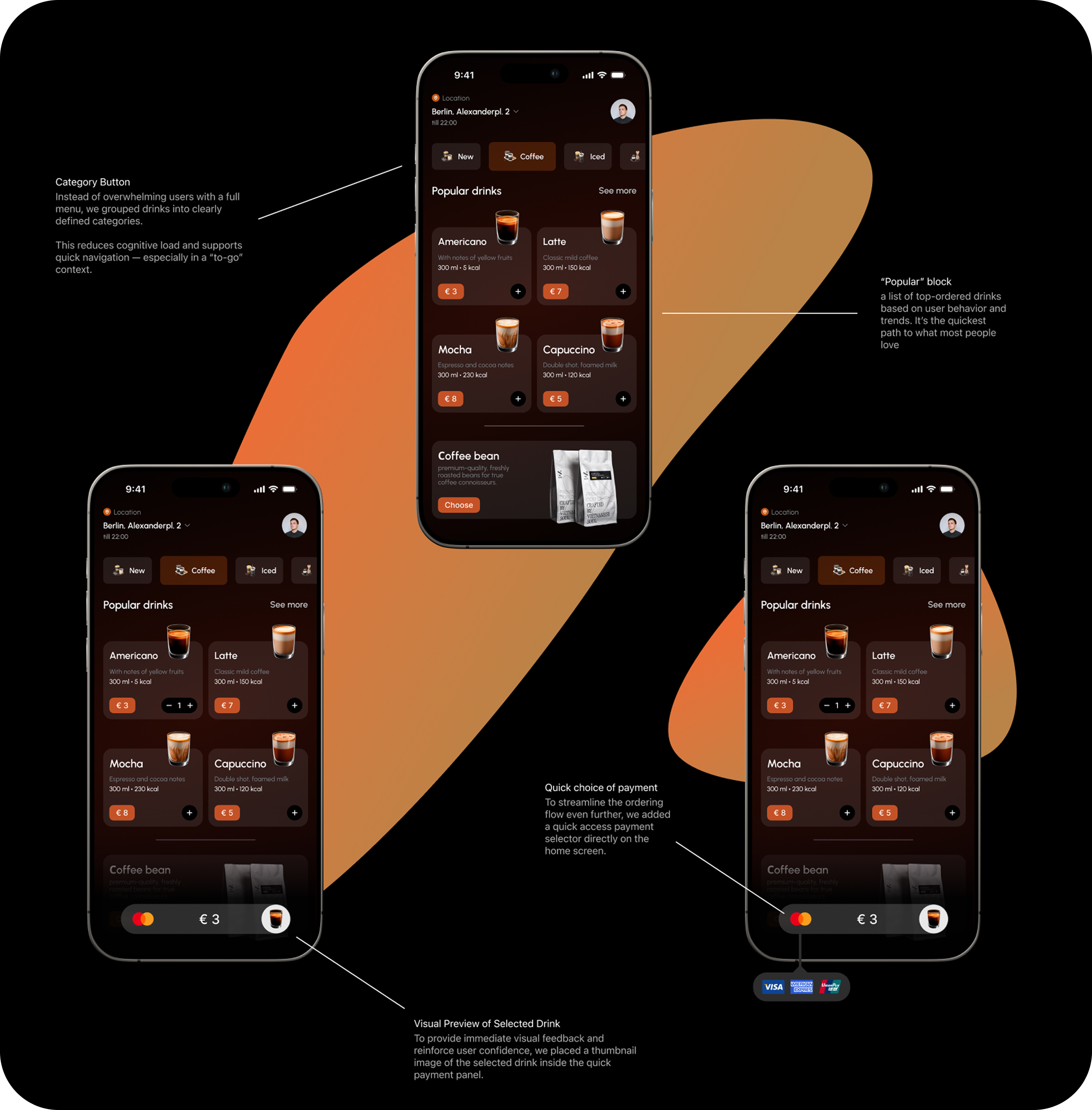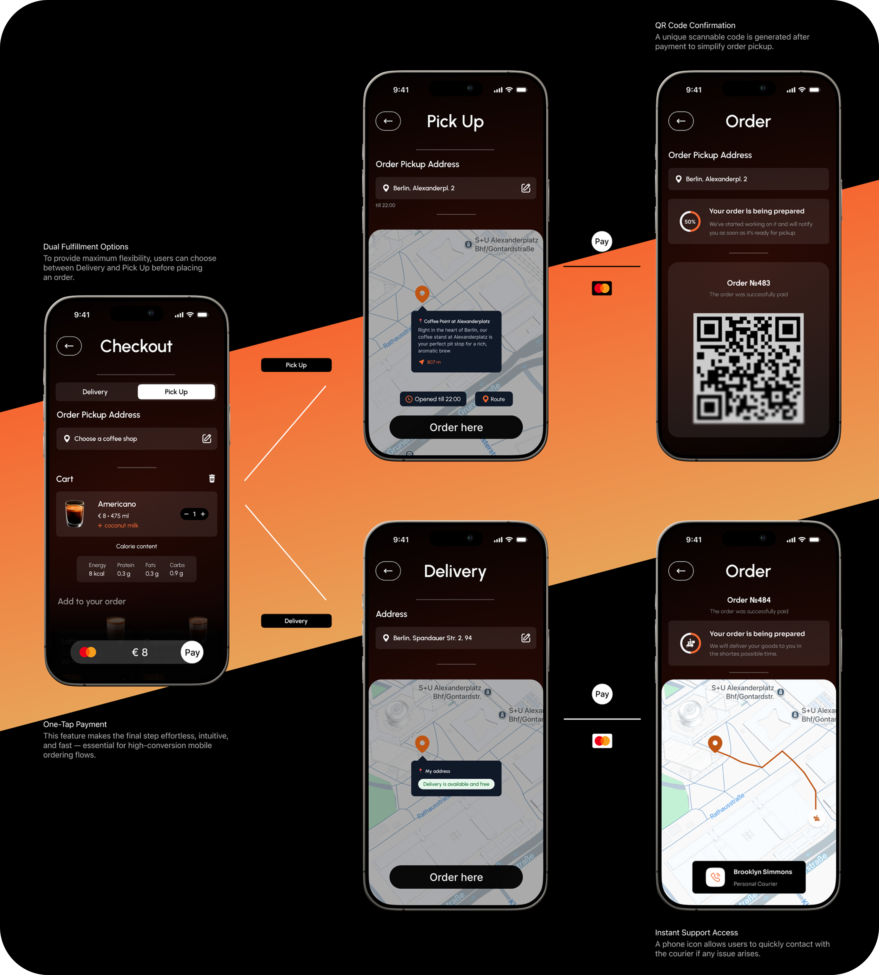 The project resulted in a fully designed end-to-end concept for a coffee ordering experience, covering the entire user journey from entry to pickup.